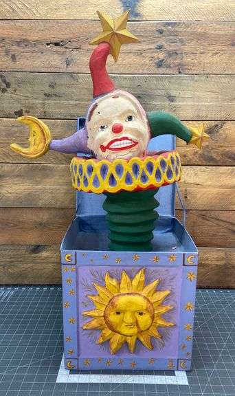 LOT 44687 - 34" Jack in the Box Statue with Clown. Paper Mache Halloween Decoration by Department 56 (note: 34" tall)