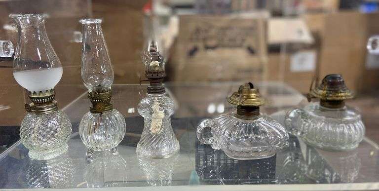LOT 44917 - 5 Mini or Hand Glass Pattern Oil Lamps