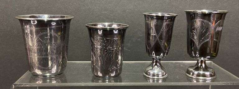 LOT 4948 - 4 Silver Cordial Cups Engraved Scenes. Hallmarked Including Russian 84 (103.02g combined)