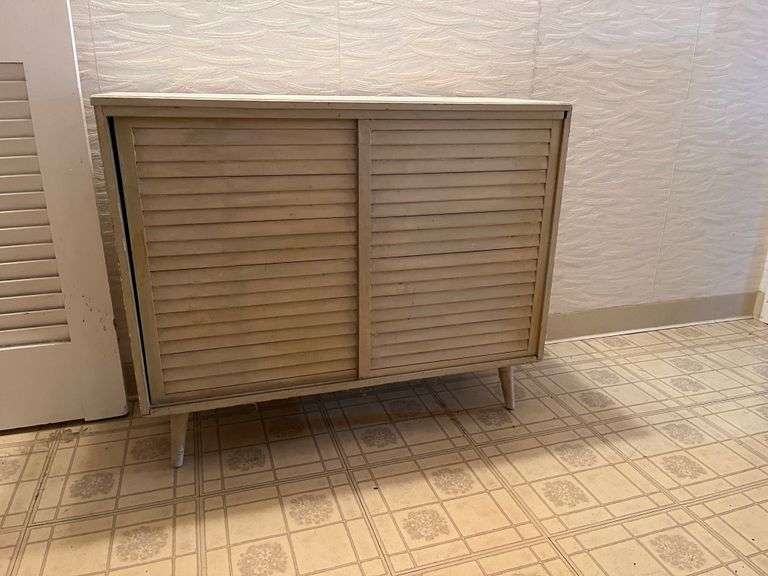 LOT 46462 - Mid Century Cabinet with Sliding Louvered Panels