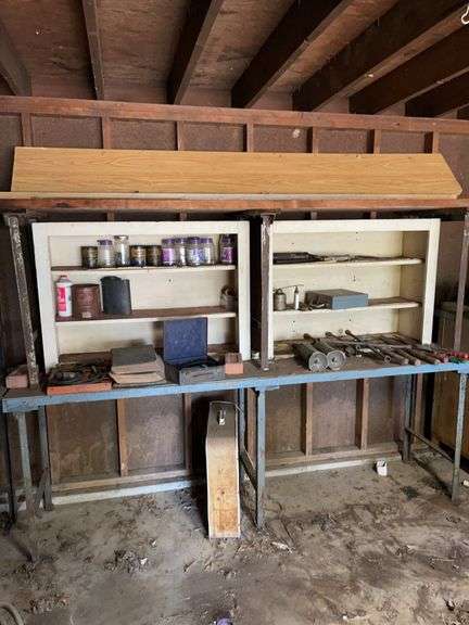 LOT 46511 - 2 8’ Workbenches, 2 White Bookshelves, 2 Formica Shelves (not other contents)