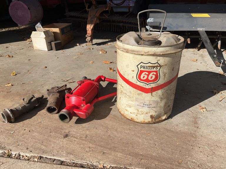 LOT 46534 - Phillips 66 5 Gallon Oil Can (feels full), Barrel Pump