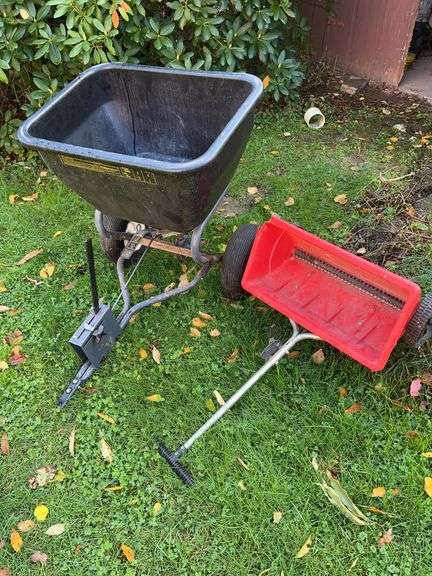 LOT 46554 - 2 Lawn Spreaders (wheels on black are seized, so not required to take both)