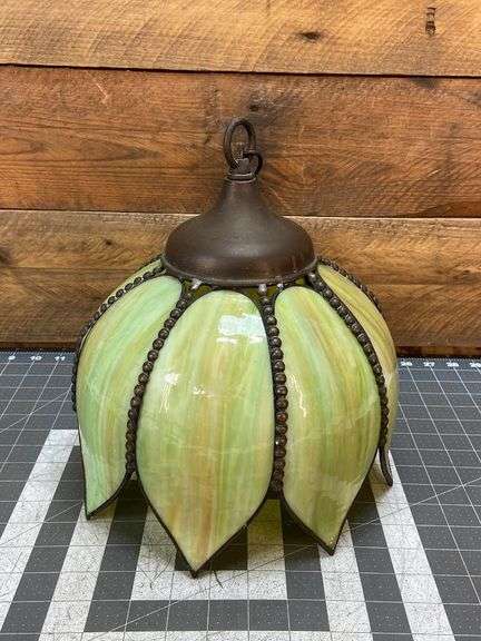 LOT 46679 - Pendant Light with Green Slag Glass Panels