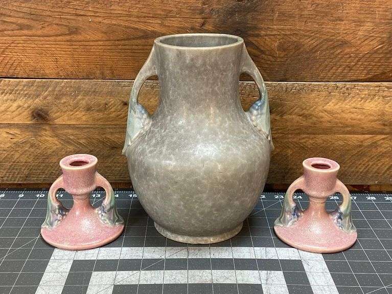 LOT 46335 - Vintage Ceramics. Candlesticks and Vase (base chips) Possibly Unmarked Roseville?