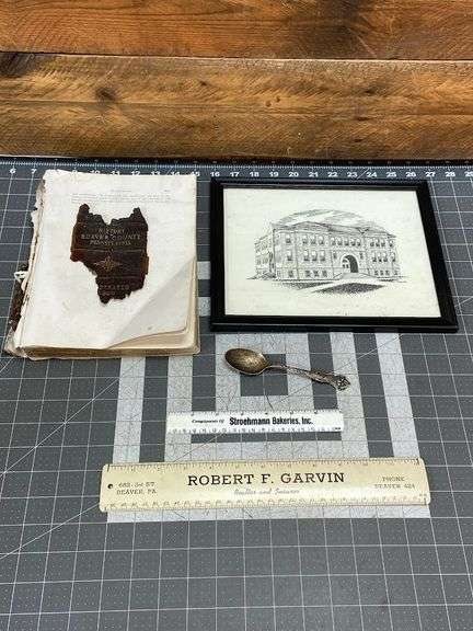 LOT 46291 - Sterling Beaver Falls Souvenir Spoon, Partial Copy History of Beaver County, Ft Mac School, Rulers
